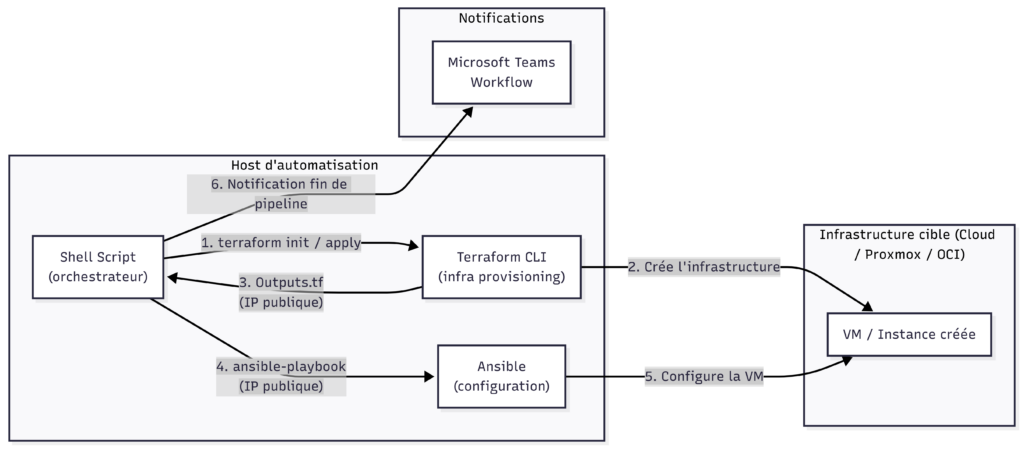 Ce shell d’orchestration devra rediriger la sortie console et erreur dans un fichier de logs afin de pouvoir suivre les erreurs d’exécutions, et également il devra rester interactif pour la première étape qui consiste à valider le plan d’exécution de terraform. Mais pour le reste il sera entièrement automatique.