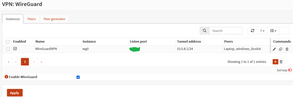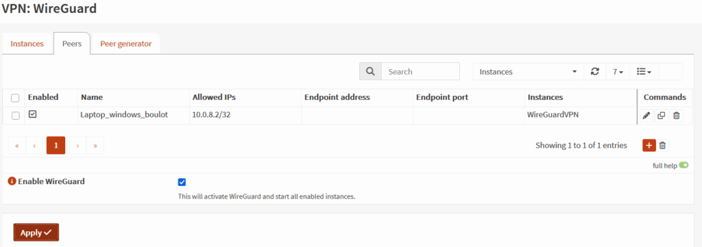Dans le menu VPN de OpenSense, vous devez « ajouter » une instance de wireguard.